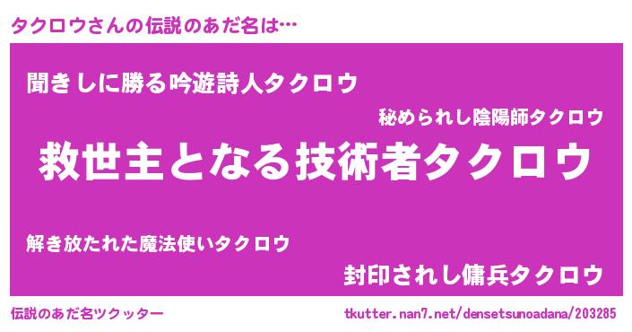 | ヒーロー風カッコイイあだ名 | 『慈愛の使者タクロウ』『仮面タクダー』 |