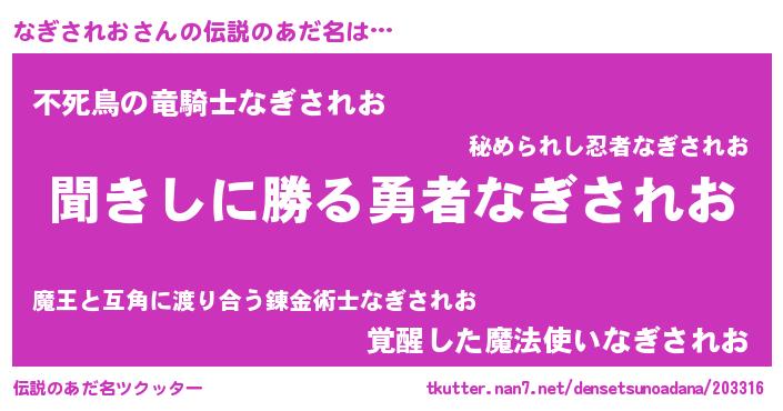 | ヘコむあだ名 | 『なぎされお(遠い目)』『なぎにー』 |