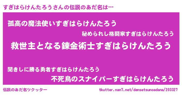 | ヒーロー風カッコイイあだ名 | 『慈愛の使者すぎはらけんたろう』 |