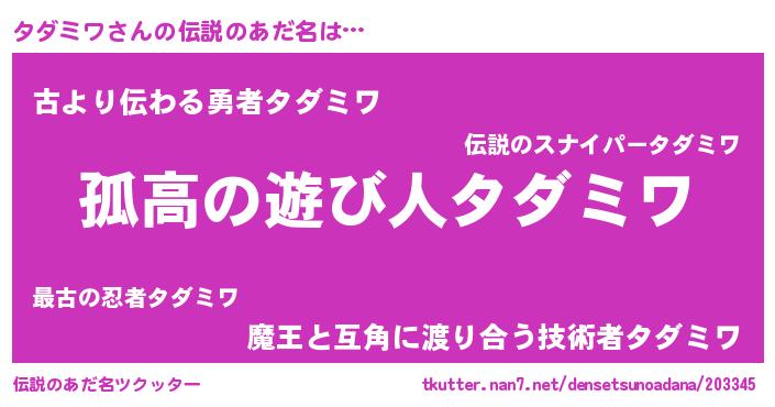| 男性向けラノベタイトル風あだ名 | 『魔弾の王とタダミワ』 |