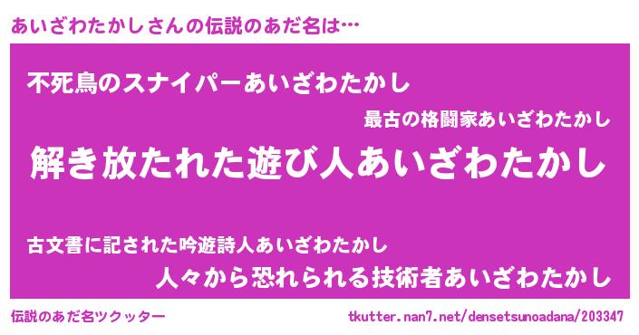| 男性向けラノベタイトル風あだ名 | 『転生したらあいざわたかしだった件』 |