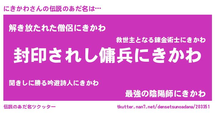| ヒーロー風カッコイイあだ名 | 『スーパーニキカワ』『魔戒騎士ニキ』 |