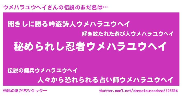 | 男性向けラノベタイトル風あだ名 | 『ウメハラユウヘイスレイヤー』 |
