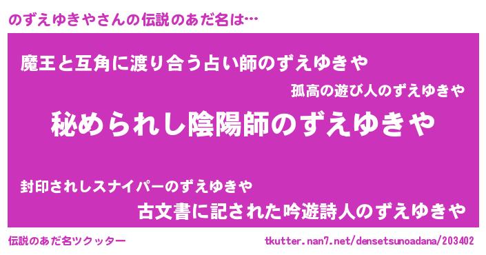 | 男性向けラノベタイトル風あだ名 | 『魔弾の王とのずえゆきや』 |