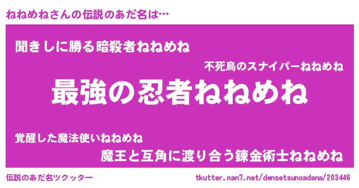 | 男性向けラノベタイトル風あだ名 | 『ねねめねに滅ぼされるだけの簡単なお仕事です』 |