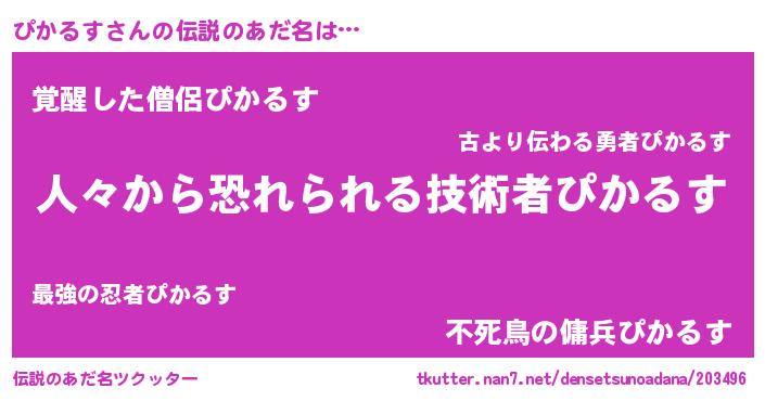 | 男性向けラノベタイトル風あだ名 | 『おまえをオタクにしてやるから、俺をぴかるすにしてくれ! 』 |
