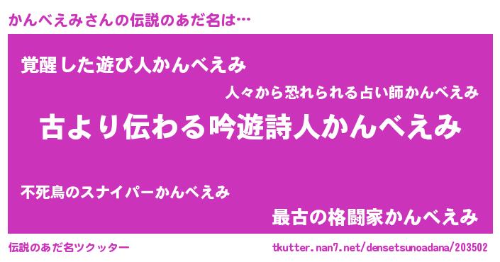 | 意味不明あだ名 | 『永久保存かんべえみ』『自称かんべえみ』 |