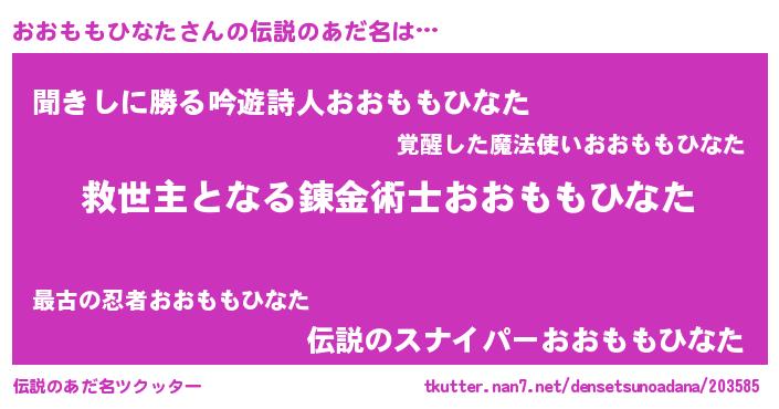 | 男性向けラノベタイトル風あだ名 | 『ノーゲーム・ノーオオモモヒナタ』 |
