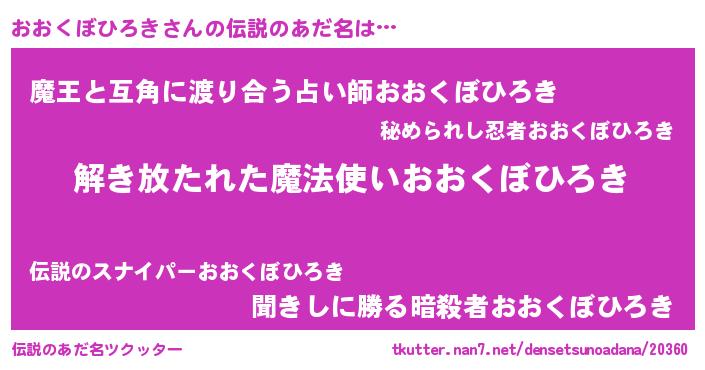 | 男性向けラノベタイトル風あだ名 | 『おおくぼひろきの嫁は女の子じゃないと思った?』 |