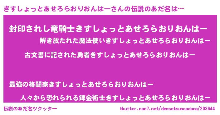 | ヘコむあだ名 | 『きすしょっとあせろらおりおんはー(震え声)』 |