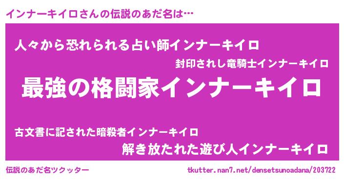 | 男性向けラノベタイトル風あだ名 | 『インナーキイロ~年齢イコール彼女いない歴の魔法使い~』 |