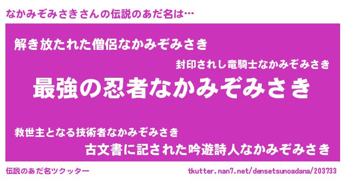 | 男性向けラノベタイトル風あだ名 | 『この素晴らしい世界になかみぞみさきを!』 |