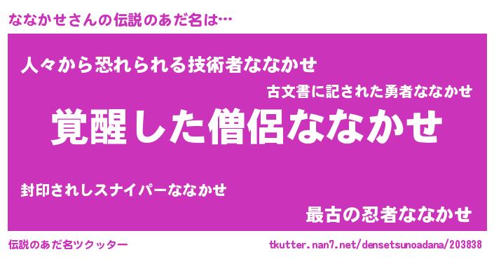 | 男性向けラノベタイトル風あだ名 | 『この素晴らしい世界にななかせを!』 |