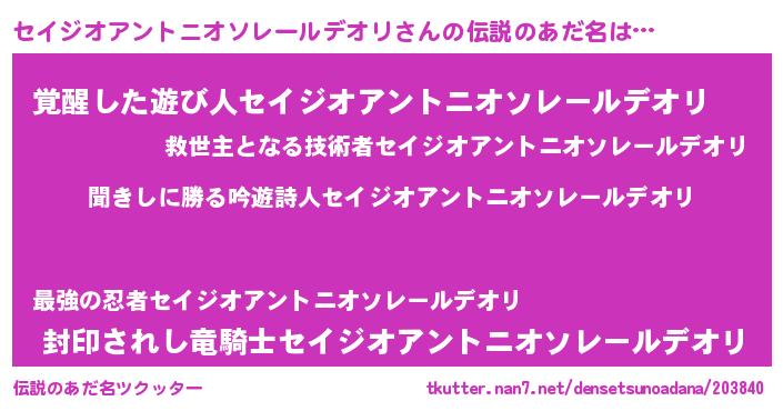 | 男性向けラノベタイトル風あだ名 | 『セイジオアントニオソレールデオリという概念が存在しない退屈な世界 』 |