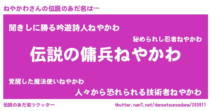 | 男性向けラノベタイトル風あだ名 | 『魔弾の王とねやかわ』『ねやかわの憂鬱』 |