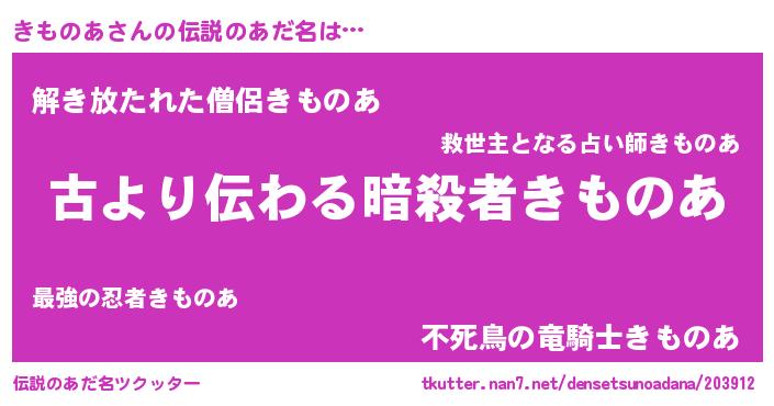 | 男性向けラノベタイトル風あだ名 | 『きものあという概念が存在しない退屈な世界 』 |