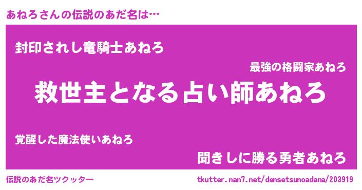 | 女子向けラノベタイトル風あだ名 | 『死神あねろの再婚』 |