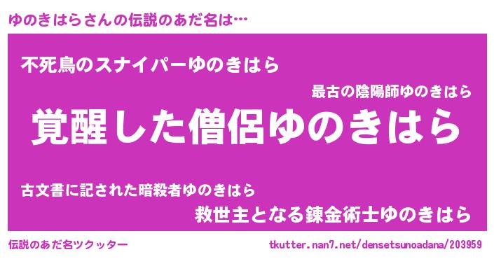 | 男性向けラノベタイトル風あだ名 | 『ゆのきはらの嫁は女の子じゃないと思った?』 |