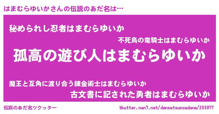 | ヒーロー風カッコイイあだ名 | 『暗黒騎士ハマ』『ネオハマムラユイカ』 |