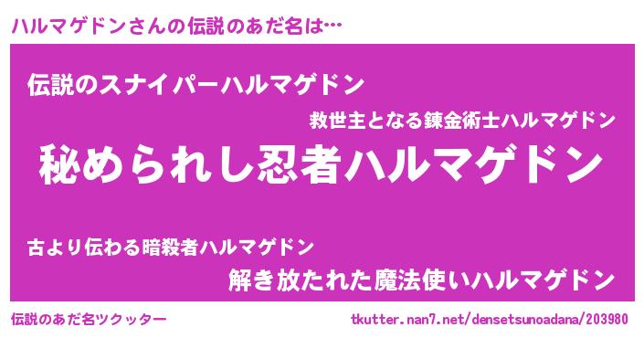 | 意味不明あだ名 | 『ハルマゲドンフォーエバー』 |