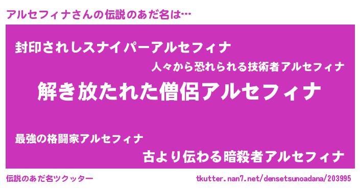 | 意味不明あだ名 | 『とにかく怪しいアルセフィナ』 |