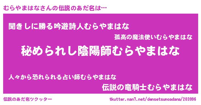 | 男性向けラノベタイトル風あだ名 | 『やはりむらやまはなの青春ラブコメはまちがっている 』 |