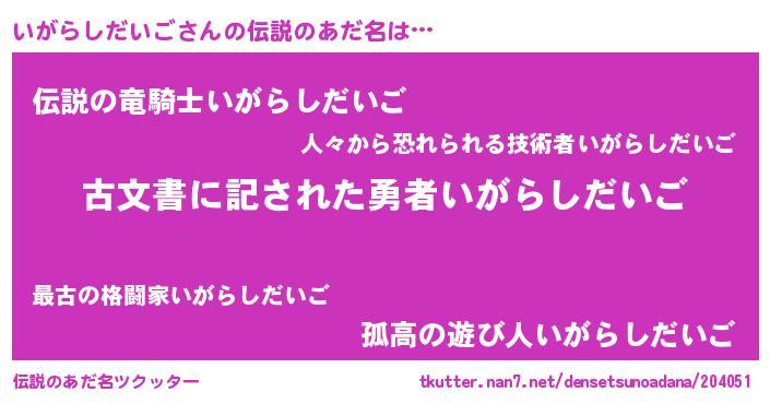 | 意味不明あだ名 | 『自称いがらしだいご』 |