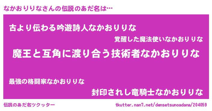 | 男性向けラノベタイトル風あだ名 | 『Re:なかおりりなから始める異世界生活』 |