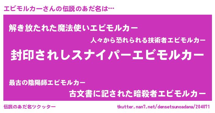 | 男性向けラノベタイトル風あだ名 | 『エビモルカーアートオンライン』 |