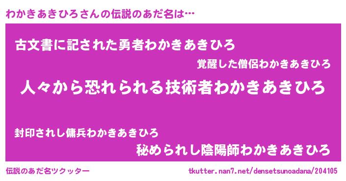 | 女子向けラノベタイトル風あだ名 | 『わかきあきひろが死なない童話 林檎のわかきあきひろの診療簿』 |