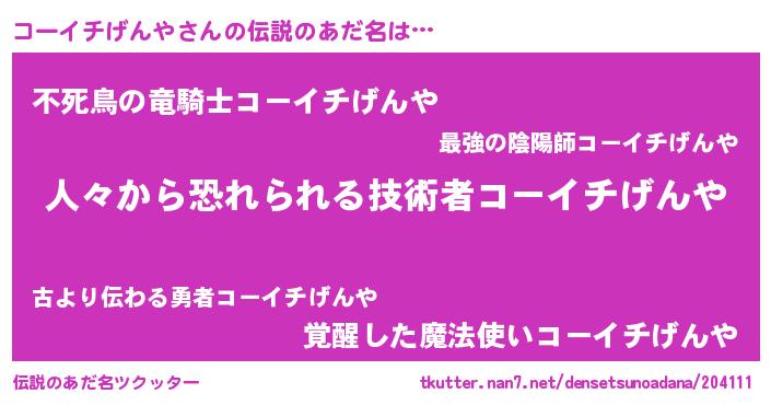 | 男性向けラノベタイトル風あだ名 | 『コーイチゲンヤスレイヤー』 |