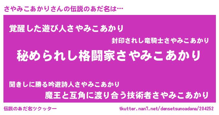| 男性向けラノベタイトル風あだ名 | 『サヤミコアカリスレイヤー』 |