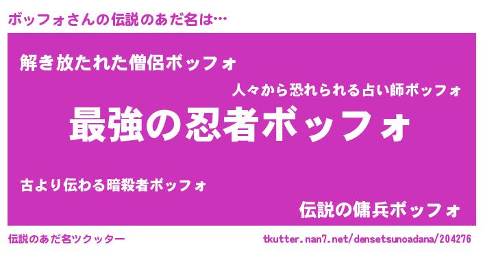 | 男性向けラノベタイトル風あだ名 | 『ボッフォ~年齢イコール彼女いない歴の魔法使い~』 |