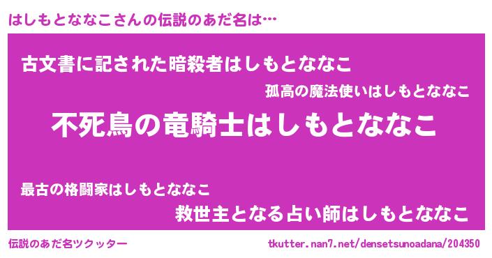 | 女子向けラノベタイトル風あだ名 | 『はしもとななこ姫と円卓の騎士』 |
