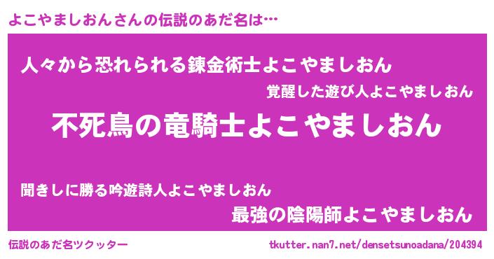 | 男性向けラノベタイトル風あだ名 | 『ヨコヤマシオンアートオンライン』 |