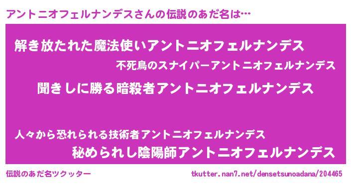 | 女子向けラノベタイトル風あだ名 | 『異世界で失敗しない100のアントニオフェルナンデス』 |