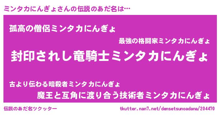 | 男性向けラノベタイトル風あだ名 | 『ミンタカにんぎょ~年齢イコール彼女いない歴の魔法使い~』 |