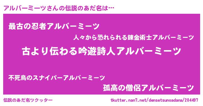 | 意味不明あだ名 | 『住所不定無職アルバーミーツ(9歳)』 |