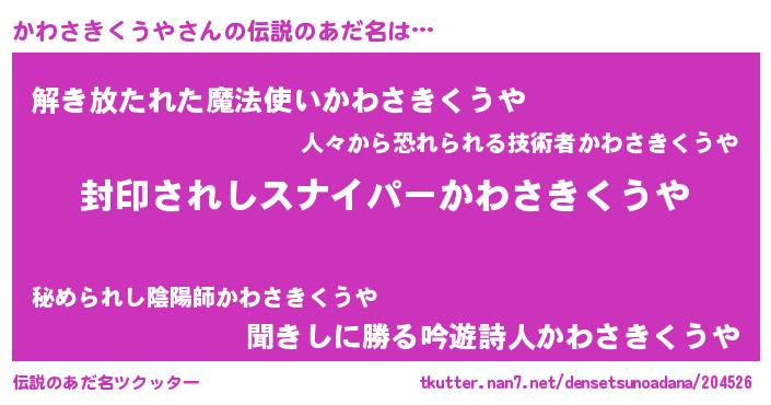 | 男性向けラノベタイトル風あだ名 | 『カワサキクウヤアートオンライン』 |