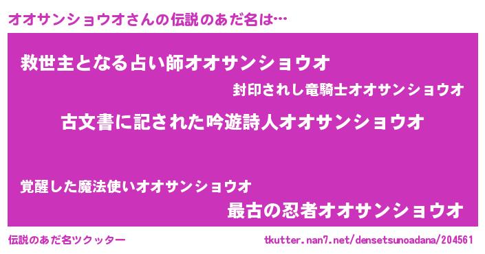 | 男性向けラノベタイトル風あだ名 | 『Re:オオサンショウオから始める異世界生活』 |