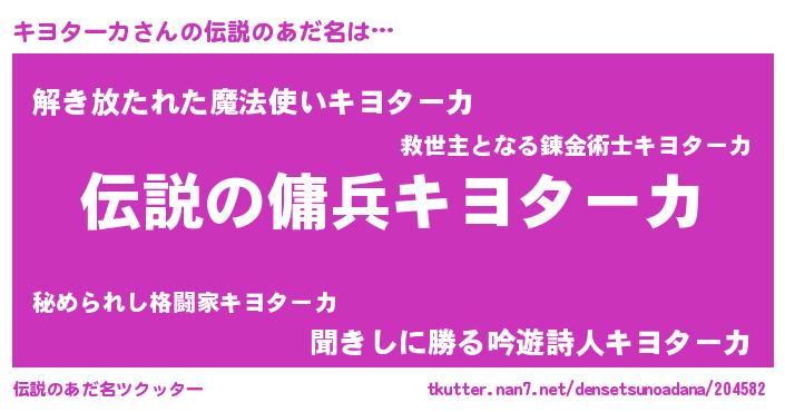 | 男性向けラノベタイトル風あだ名 | 『魔弾の王とキヨターカ』 |