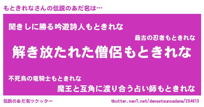 | 男性向けラノベタイトル風あだ名 | 『Re:もときれなから始める異世界生活』 |