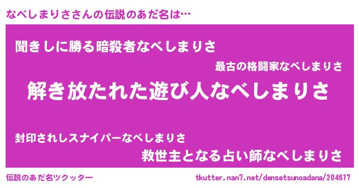 | 胡散臭い通販商品みたいなあだ名 | 『世界中を虜にした世界で10本だけ現存している希少なブランデー…その名も「なべしまりさ」』 |