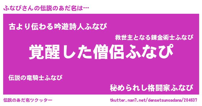 | 男性向けラノベタイトル風あだ名 | 『ふなぴの嫁は女の子じゃないと思った?』 |
