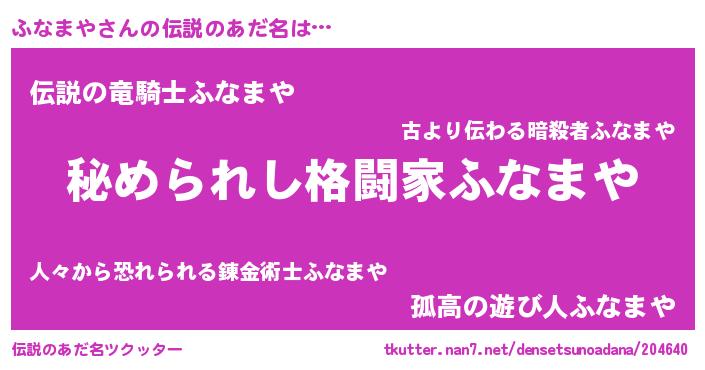 | 男性向けラノベタイトル風あだ名 | 『フナマヤスレイヤー』『ふなまやの憂鬱』 |