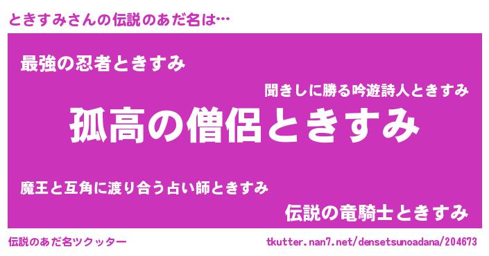 | ポケモン風あだ名 | 『ヒトキスミ』『トキゴンZ』 |
