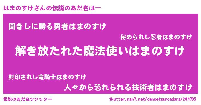 | 男性向けラノベタイトル風あだ名 | 『転生したらはまのすけだった件』 |