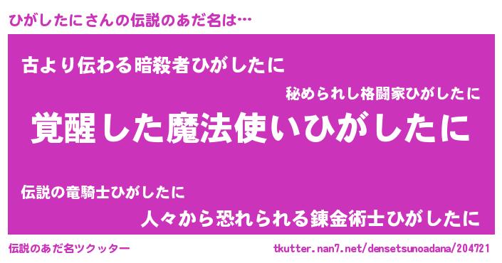 男性向けラノベタイトル風あだ名 | 『ひがしたに~年齢イコール彼女いない歴の魔法使い~』 |