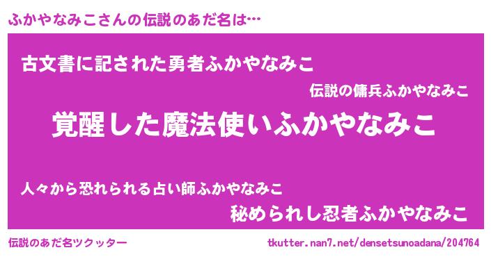 | ポケモン風あだ名 | 『フカキング』『ヒフカヤナミコ』 |