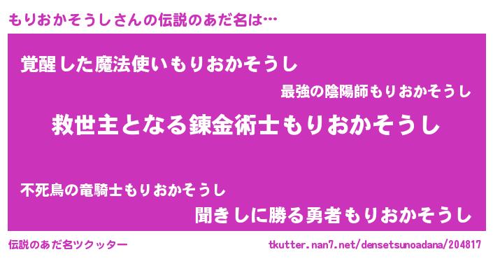 | 男性向けラノベタイトル風あだ名 | 『もりおかそうし~年齢イコール彼女いない歴の魔法使い~』 |